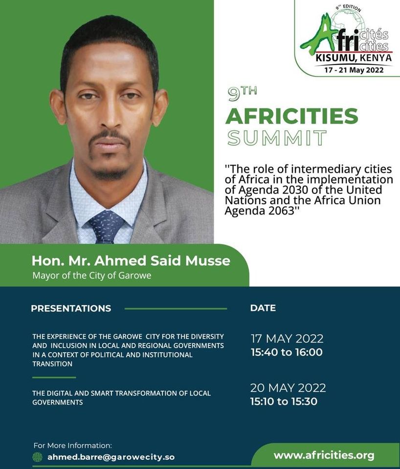 The Chairman of the Association of Local Government Associations of Puntland (ALGAPL) and the Mayor of the Puntland Capital of Garowe Mr. Ahmed Said Muse will attend the 9th African Summit to be held in KISUMU Kenya from 17 – 21 May 2022.